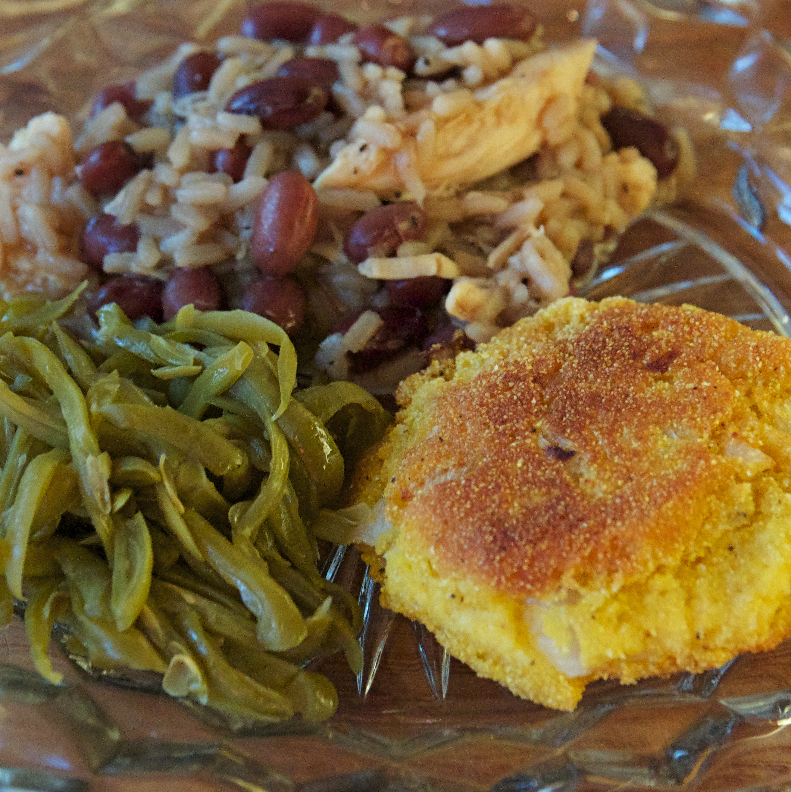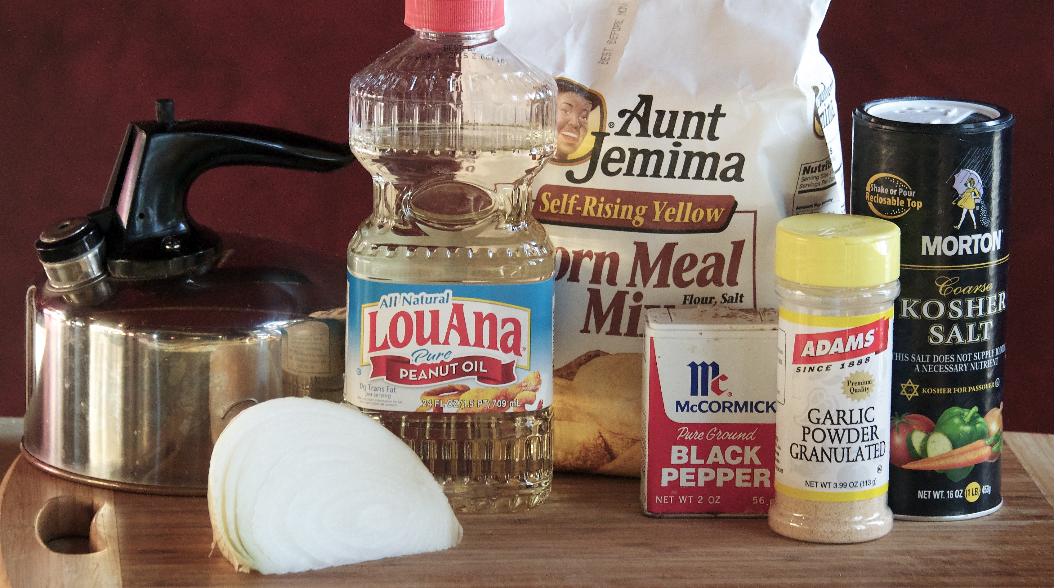 The Instructions: Combine about a cup and a half of corn meal mix with a dash of salt, a generous couple of shakes of pepper, a smidgeon of garlic powder and a handful of chopped onion. Slowly add boiling hot water and stir with a spoon until it all sticks together. Heat a little over a 1/4 inch of peanut oil in your skillet to around 400°F. Form the corn meal mixture into patties and fry until brown on the outside and done on the inside (two to three minutes each side).