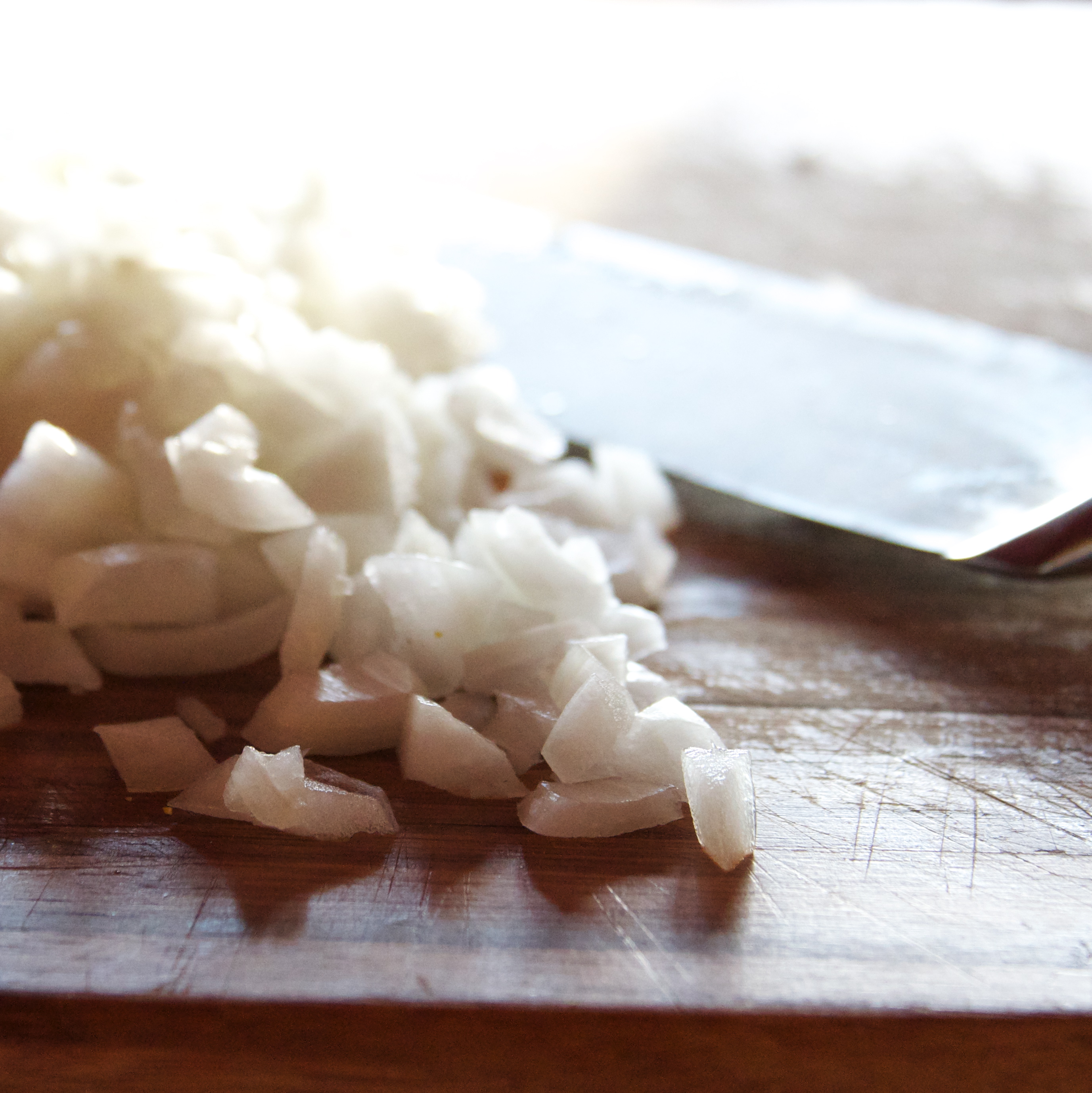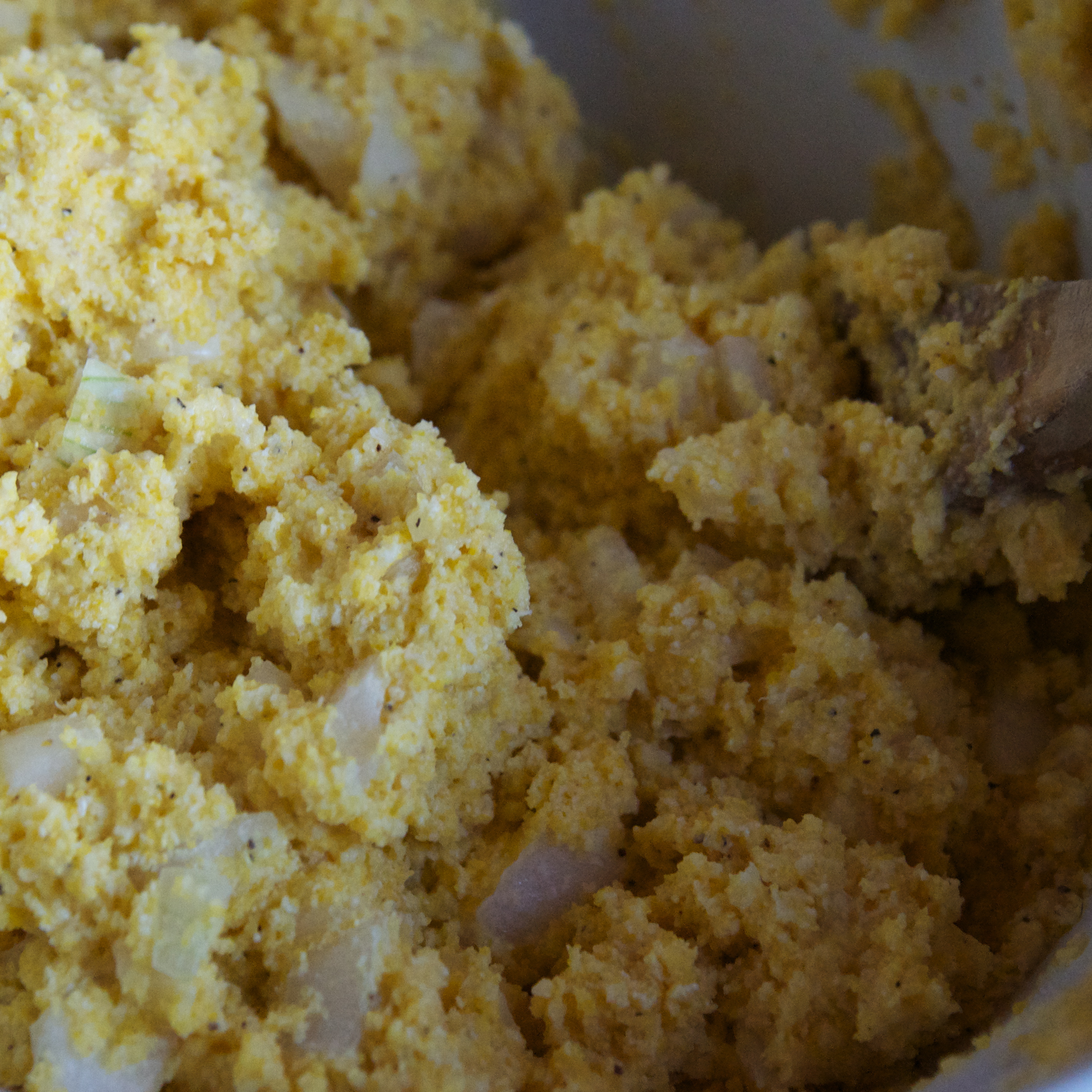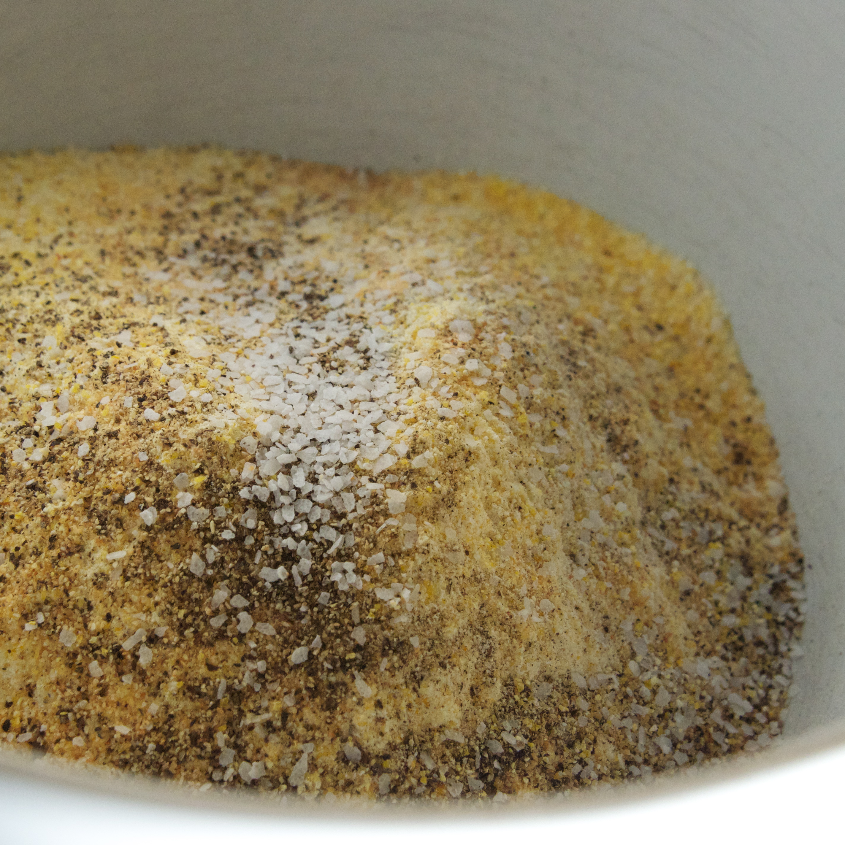 The Ingredients: Boiling water, corn meal mix, salt, pepper, garlic powder, chopped sweet onion, peanut oil