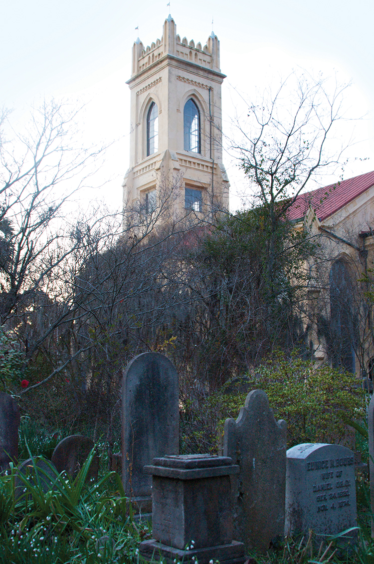 I turn and make my way down the uneven brick path and find myself in a secret garden of a graveyard. It’s twilight and completely still except for a few sparrows rusting in dried leaves on the ground. I pause, taking in the peacefulness and, while reading the gravestones, realize why this place feels so different. Except for the walkways, which are kept clear for wandering visitors like me, the rest of the cemetery is given over to nature and the native Lowcountry plants reign supreme.