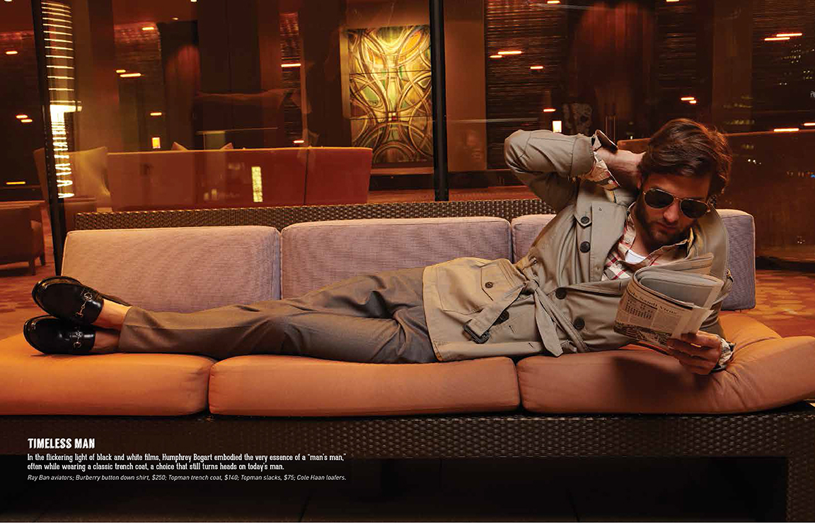 In the flickering light of black and white films, Humphrey Bogart embodied the very essence of a “man’s man,” often while wearing a classic trench coat, a choice that still turns heads on today’s man. Ray Ban aviators; Burberry button down shirt, $250; Topman trench coat, $140; Topman slacks, $75; Cole Haan loafers.