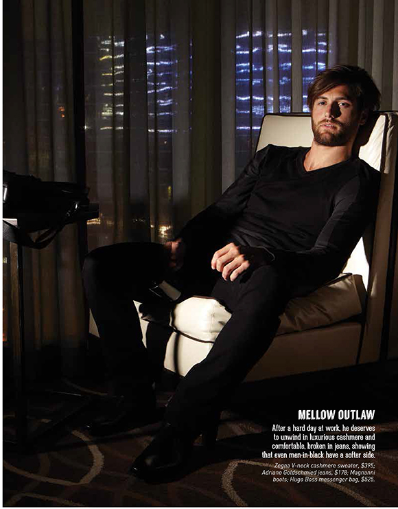 After a hard day at work, he deserves to unwind in luxurious cashmere and comfortable, broken in jeans, showing that even men-in-black have a softer side. Zegna V-neck cashmere sweater, $395; Adriano Goldschmied jeans, $178; Magnanni boots; Hugo Boss messenger bag, $525.