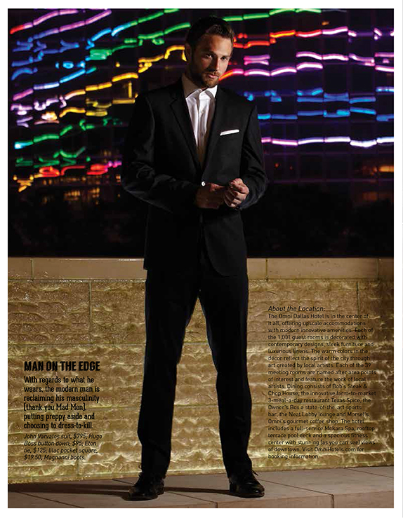 With regards to what he wears, the modern man is reclaiming his masculinity (thank you Mad Men), putting preppy aside and choosing to dress-to-kill. John Varvatos suit, $795; Hugo Boss button down, $95; Eton tie, $125; lilac pocket square, $19.50; Magnanni boots.