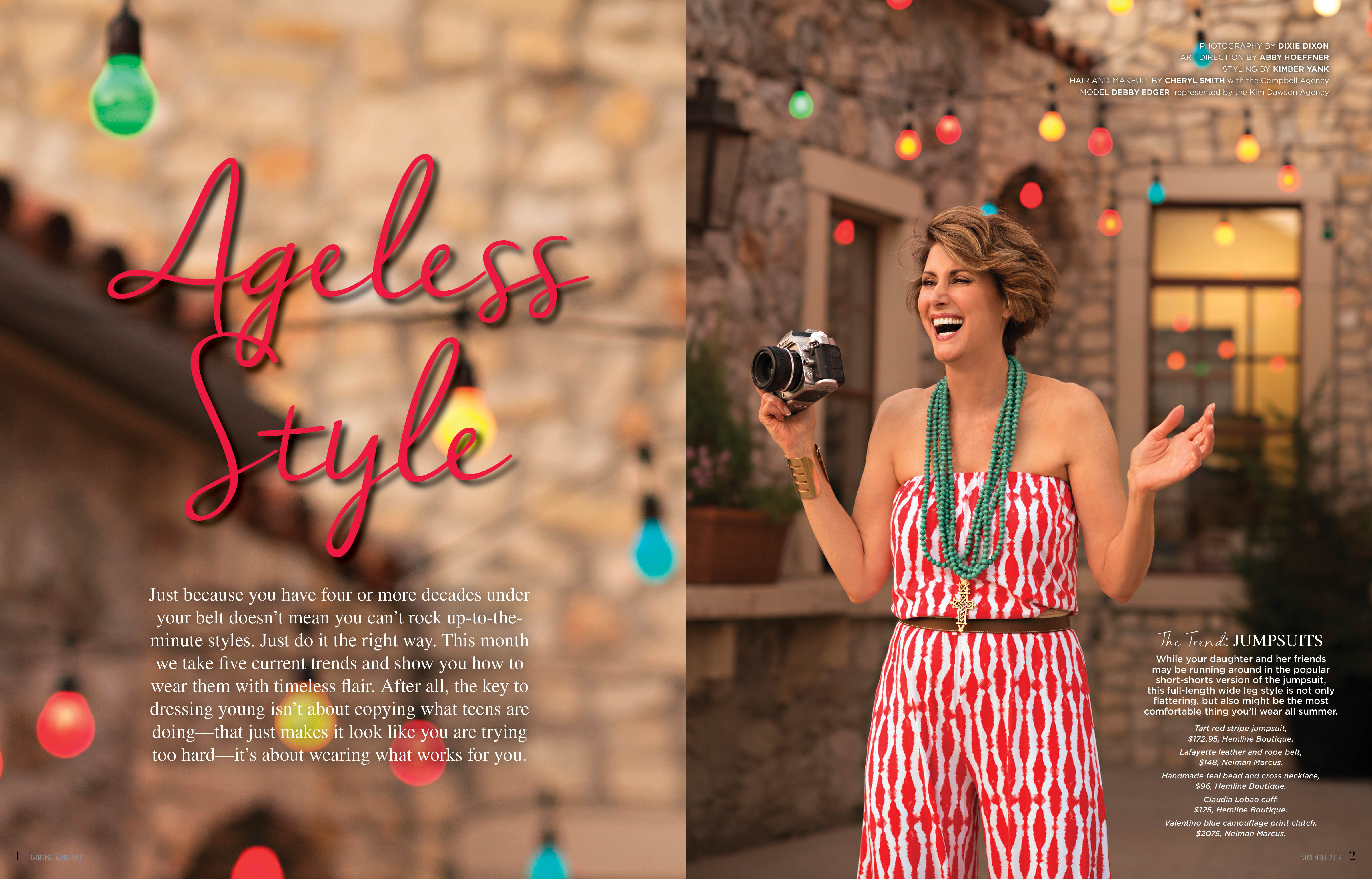 I art directed this fun shoot for the July issue of Living Magazine. When brainstorming about what “ageless style” really meant, I realized that I wanted to do a piece on how to dress younger without dressing too young. Dallas stylist Kimber Yank took my vision and pulled clothes that perfectly represented that concept. The talented Dixie Dixon photographed the shoot with her great ability to capture those “lifestyle” moments. And hair and makeup artist, Cheryll Smith, showed how a short hair cut can be young and fun, and kept model Debby’s makeup clean and fresh. Read on for how to translate these trends into an ageless option.